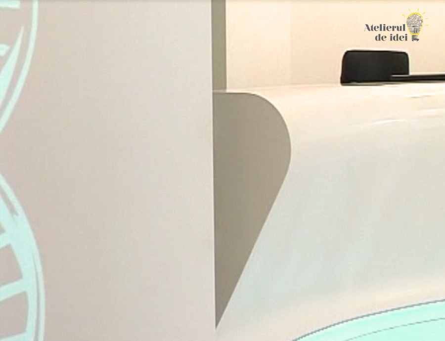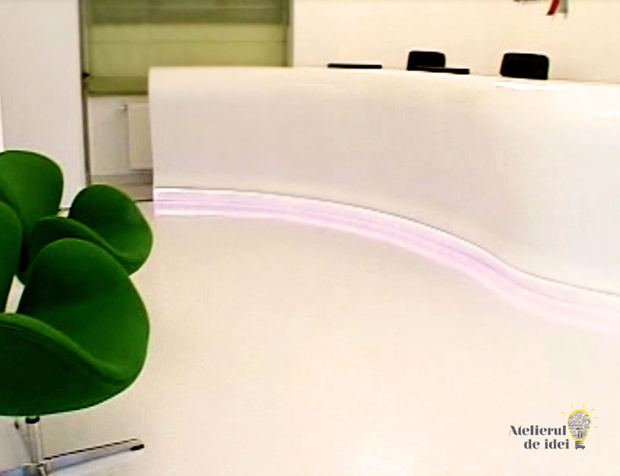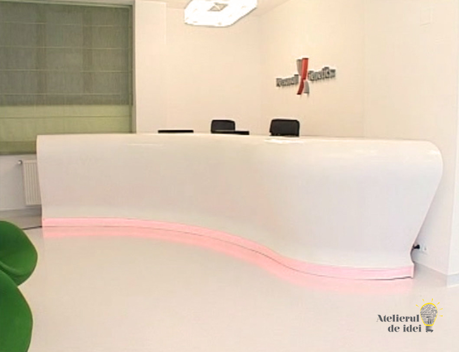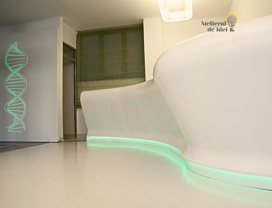 Un proiect in care putem spune ca a fost acceptata provocarea noului – in cazul de fata utilizarea unui material de ultima generatie – piatra acrilica naturala. Materialul isi demonstreaza versatilitatea, indeplinind toate cerintele si garantand un nivel ridicat de calitate si functionalitate. Pe langa vedeta spatiului – front-desk–ul de un alb imaculat si forma curbata, fluida – se face remarcat si panoul decorativ din stanga acesteia, ce contine un element surpriza – un model gravat la interior, ce sugereaza imaginea stilizata a unei molecule adn, prin care isi face loc lumina jucausa.