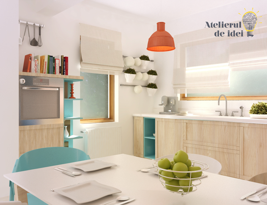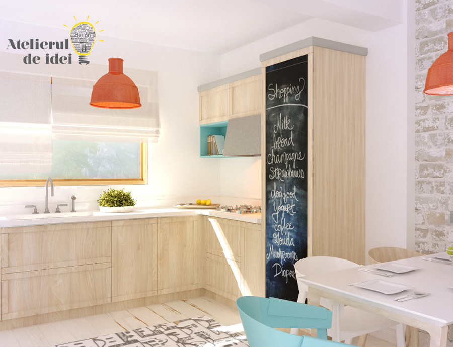 Un interior modern si jucaus, asa putem descrie in doua cuvinte proiectul de mai sus. Cei trei membri ai familiei si-au aplecat atentia asupra constructiilor durabile si avantajelor permaculturii. Ca urmare, amenajarea propusa de noi foloseste materiale si culori naturale, caramida aparenta, dusumele din lemn , textile din in si nu numai. Sa nu uitam de micile accente de culoare, regasite in accesorii sau in insertiile mobilierului de bucatarie.
