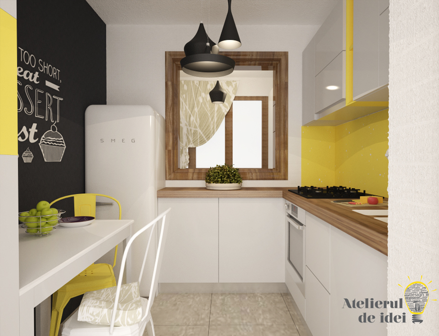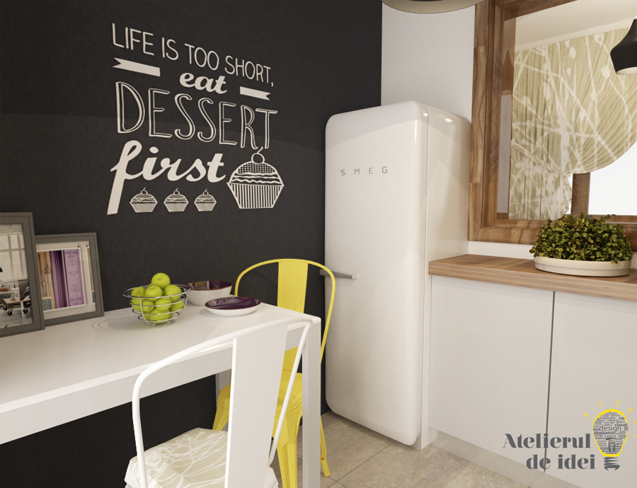 Si cum amenajarea unui spatiu mic merge mana in mana cu organizarea si functionalitatea – mai ales cand vorbim despre o bucatarie – am ales sa nu ne abatem de la regula. Am plusat insa cand am decis sa ne folosim de mici trucuri pentru a lasa deoparte imaginea unei bucatarii obisnuite: am aplicat un „tratament deosebit” unuia dintre pereti – vopsea cu aspect de tabla de scris – scotand astfel in evidenta zona locului de luat masa cu depozitarile aferente.