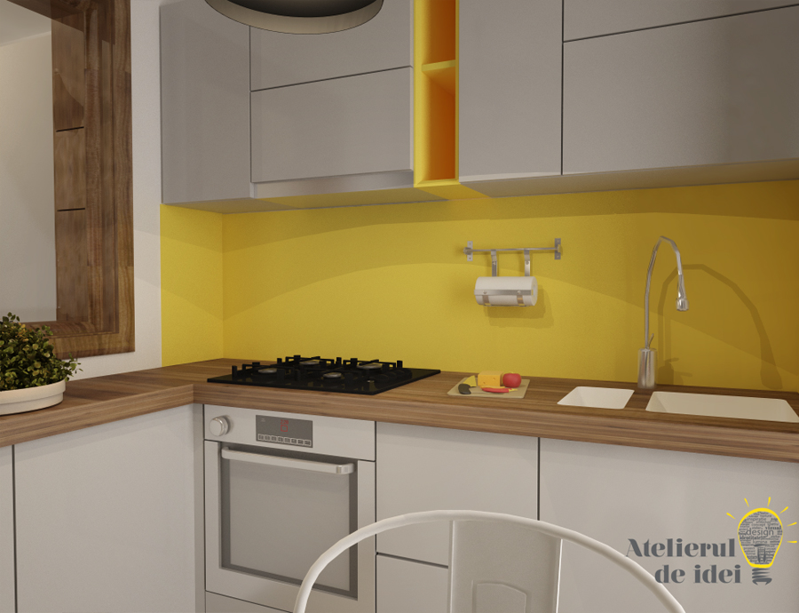 Mobilierul in nunata deschisa – alb murdar – a fost completat prin accentele de culoare – galben cald - ale corpurilor de depozitare deschise, aruncate ici acolo. Finisarea cu sticla a portiunii dintre blat si suspendate ofera senzatia de marire a spatiului, elementele din incapere regasindu-se frumos reflectate in aceasta.