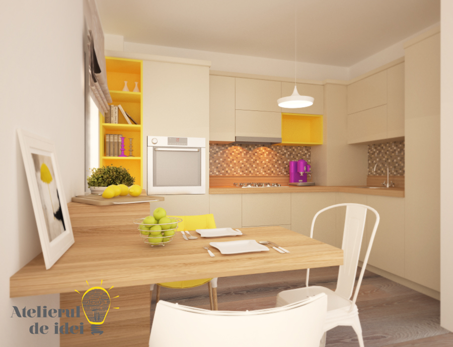 O alta bucatarie care trebuia complet revigorata ne-a pus la lucru. Este vorba despre zona de living si bucataria deschisa a unei garsoniere spatioase, cu vedere superba spre padure.