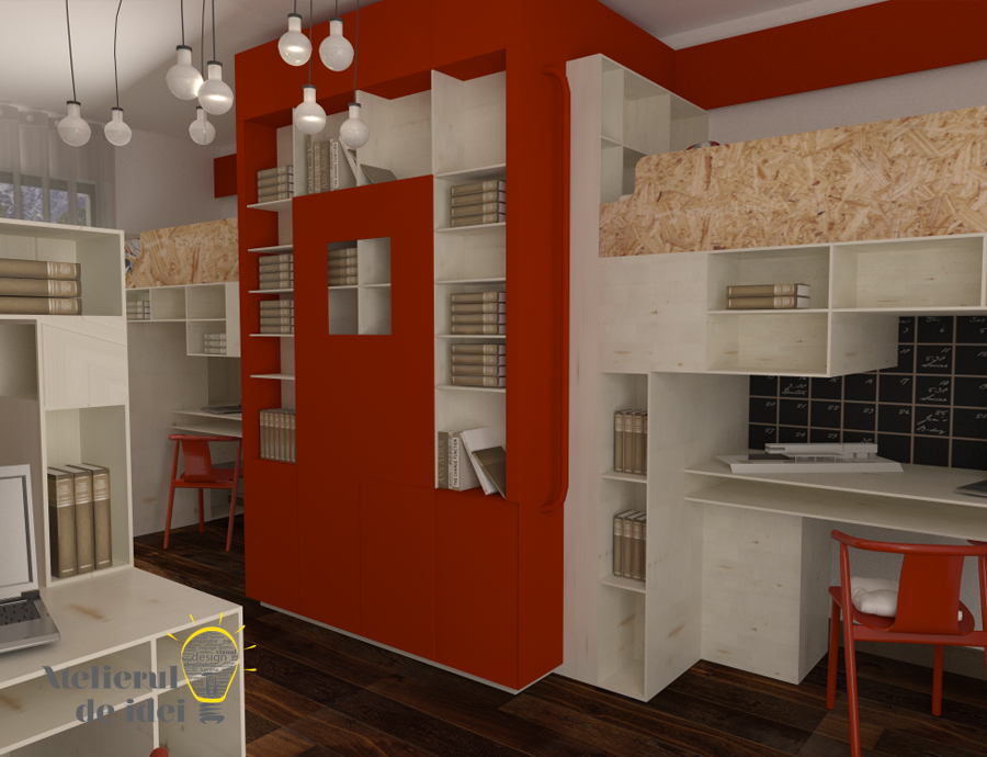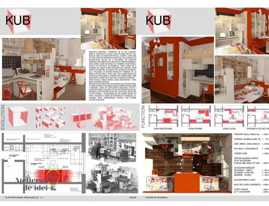 Folosind un sistem modular, pornind de la simpla structura a unui cub (sau subdiviziuni ale acestuia), propunem o varianta de amenajare care reuneste o serie de functiuni grupate in module comune – zona studiu, zona odihna, zona depozitare – fara insa a incarca spatiul. Constransi de un anumit buget dat, au fost propuse o serie de materiale si finisaje accesibile, care armonizeaza spatiul prin forme si culori.